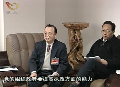 湖北省政協(xié)委員王敬璋 :" 黨的組織 政府 要提高執(zhí)政方面的能力 政協(xié)要提高參政議政能力 都要學(xué)習(xí)提高 是學(xué)習(xí)胡錦濤同志這一兩年來(lái)集中全黨智慧 提出的系列重大理論問(wèn)題 比如說(shuō)以人為本的問(wèn)題 執(zhí)政為民的問(wèn)題 科學(xué)發(fā)展的問(wèn)題 以及和平崛起 和平發(fā)展問(wèn)題 和建設(shè)和諧社會(huì)問(wèn)題 "