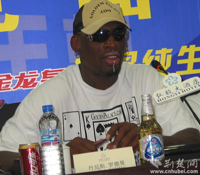 在記者會(huì)上,曾和喬丹、皮蓬一起被稱為“公牛鐵三角”、七屆NBA籃板的丹尼斯.羅德曼格外引人注目,記者圍繞著一些球迷感興趣的話題對(duì)他進(jìn)行了采訪。當(dāng)有人問起他為什么在見面會(huì)上會(huì)這么平靜時(shí),他的回答幽默又讓人充滿期待:這里有這么多的攝影機(jī)、照相機(jī)和記者朋友,施展不開,當(dāng)然要平靜。賽場(chǎng)上的我和此時(shí)的我完全不同,想看一個(gè)真正的羅德曼,明天去賽場(chǎng)吧。