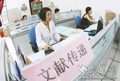 7日,武大圖書館接到網(wǎng)上求助:該校博士生王莉娟申請查詢1984年某國外刊物。館員雷霆(左)打開“中國高等教育文獻保障系統(tǒng)”,僅用2分鐘便查詢到解放軍醫(yī)學(xué)圖書館藏有該刊,她向?qū)Ψ桨l(fā)出索取請求。
