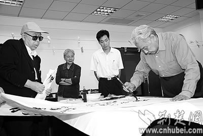 九九重陽節(jié),武漢市老年書畫研究會(huì)的20多位老書畫家,應(yīng)邀參加“紀(jì)念抗戰(zhàn)勝利六十周年書畫筆會(huì)”。圖為原解放軍總后武漢基地指揮部中將司令員、武漢市老年書畫研究會(huì)名譽(yù)會(huì)長張書坤奮筆作書“勿忘國恥,不辱使命”八個(gè)遒勁有力的大字。