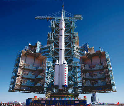長(zhǎng)征二號(hào)F型火箭等待著它的第6次飛行。兩小時(shí)45分鐘前,執(zhí)行神舟六號(hào)載人航天飛行任務(wù)的航天員費(fèi)俊龍和聶海勝進(jìn)入飛船返回艙,“神箭”和“神舟”第一次迎來(lái)了兩名乘客。