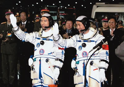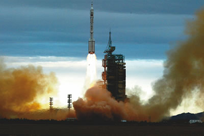 9時(shí)整,費(fèi)俊龍、聶海勝乘坐神舟六號(hào)飛船在長(zhǎng)征火箭的托舉下,飛向太空。