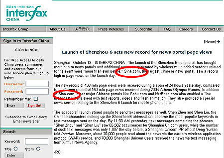 10月14日,俄羅斯國際文傳社報(bào)道神六使中國新聞門戶網(wǎng)頁面流量創(chuàng)新高。
