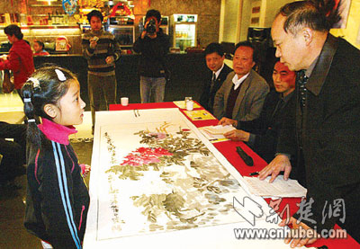 “劉老師,看看我的畫吧!”9歲的張俁俁是武昌中華路小學(xué)學(xué)生,她第一個交出自己的牡丹長卷請老師“檢閱”。陪同前來的母親吳女士在一旁介紹:“俁俁看到報紙后就一直惦念這事。今天一早她就起床了,拉著我跟她外婆往這趕。”