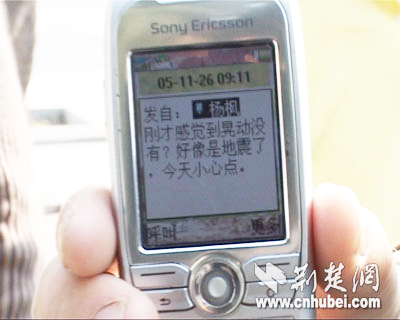 用戶:ymcbz 今天上午8時(shí)45分左右,我們還以為起了大風(fēng)……有的人已經(jīng)跑到樓下:是不是有地震? 五樓的小涂說(shuō):太陽(yáng)能水管在擺動(dòng)……前樓的小王說(shuō):窗簾斜擺,風(fēng)鈴發(fā)聲! 家里魚缸的水晃出來(lái)了! 縣檢察院正在開(kāi)會(huì),桌上的茶杯晃動(dòng),大家都往樓下跑。 感謝荊楚網(wǎng),快速告訴了我們事實(shí)的真相!