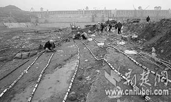 2月27日下午,雨霧中的爆破現(xiàn)場一片寂靜。6條長90米、直徑0.6米的吸水鋼管已停止向圍堰基坑內(nèi)充水;觾(nèi),一泓江水微波蕩漾。
