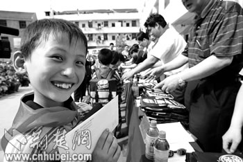 我省2005年春季“希望工程助學進城計劃———金龍魚農(nóng)民工子女助學金”本月起開始陸續(xù)發(fā)放,1000余名在漢打工的農(nóng)民工子女可獲得每學期300元的資助款。預計五年內(nèi),我省將有4000人次的農(nóng)民工子女獲此項資助。圖為武漢市東升學校二年級的李灣小朋友領到助學金后高興地笑了。
