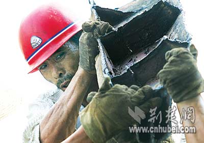現(xiàn)場(chǎng)施工的8名農(nóng)民工都來(lái)自監(jiān)利縣。他們有的用焊槍切割船體,有的將割好的鋼板搬到岸上。每塊鋼板重約80公斤,兩個(gè)人抬著走,豆大的汗珠布滿黝黑的臉龐,隨著移動(dòng)的腳步一滴滴滾落地上。