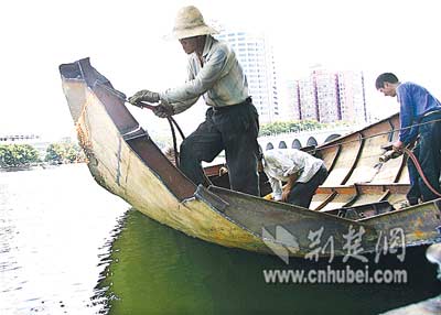 “船太大了,沒辦法運(yùn)出城,只好進(jìn)行分解后運(yùn)走!必(fù)責(zé)現(xiàn)場(chǎng)施工的馬先生解釋,2002年初,他所在的公司承攬東湖清淤工程,共運(yùn)來(lái)8條清淤船,其中一條船放置在水果湖。當(dāng)時(shí),經(jīng)有關(guān)部門批準(zhǔn),這些船由大型車輛運(yùn)來(lái)并吊入湖中。目前清淤工程結(jié)束,湖中的船不好運(yùn)走,只好割成一塊塊鋼板,當(dāng)成廢鋼賣掉。