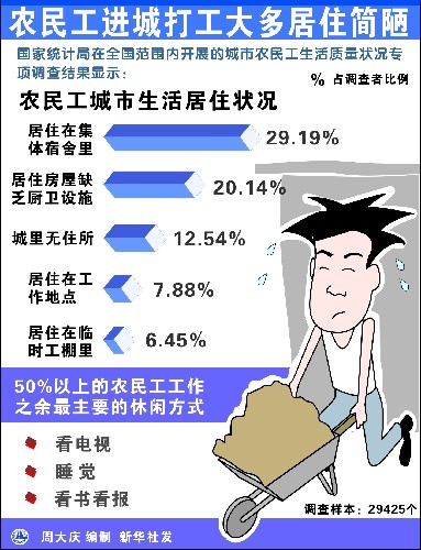 農(nóng)民工在城市打工,大多居住在簡(jiǎn)陋的宿舍里。據(jù)調(diào)查,有29.19%的農(nóng)民工居住在集體宿舍里,有20.14%的農(nóng)民工居住在缺乏廚衛(wèi)設(shè)施的房間里,有7.88%的農(nóng)民工居住在工作地點(diǎn),有6.45%的農(nóng)民居住在臨時(shí)搭建的工棚里,還有12.54%的農(nóng)民工在城里沒有住所,只能往返于城郊之間,或回農(nóng)村居住。