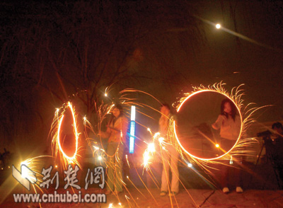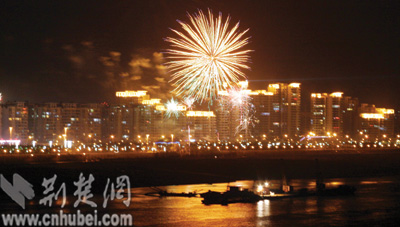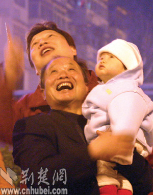 漢陽(yáng)的劉春華一大家子人特別引人注目,因?yàn)樗麄優(yōu)榇蠡镎故玖艘粓?chǎng)小型的私人焰火晚會(huì)。她的四兄弟姊妹,從面包車上扛下大包大包箱子般大小的焰火,依次在江邊擺開(kāi)。不一會(huì),幾道彩色的光柱就在天空閃耀,彩色幕布被拉開(kāi)。震耳的轟響,讓孩子們又愛(ài)又怕,躲在父母的身后偷偷地捂著耳朵跳鬧。70多歲的爺爺奶奶微笑著,安靜地看著自己十多個(gè)子子孫孫們歡暢的一幕。