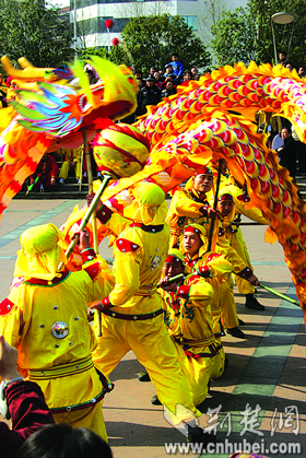巨龍吶喊,昂首向前跑;鞭炮助威,鼓點聲聲急;禮花漫天,寄托著人們美好的心愿——明天更燦爛。