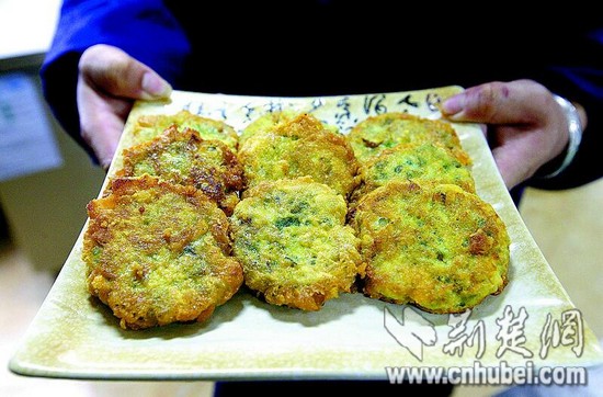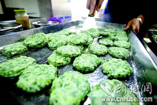 湖北日?qǐng)?bào)訊 早春,野菜餅成為咸寧市百姓一道特色佳肴。制作野菜餅時(shí),先取新鮮魚肉打成魚蓉,再將采摘的新鮮野芹菜、野韭菜等切成沫,加入魚蓉混合攪勻,制成直徑十厘米大小的小餅上蒸鍋蒸,再裹上蛋黃煎至金黃,清香撲鼻。