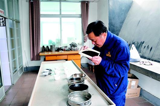 湖北省趙李橋茶廠有限責(zé)任公司檢驗(yàn)室內(nèi),59歲的甘多平將青褐色磚茶原料倒入評(píng)茶盤(pán)內(nèi),緩緩搖動(dòng)后,仔細(xì)端詳、細(xì)嗅香氣,“顆粒勻、香氣正,這批原料不錯(cuò)。”