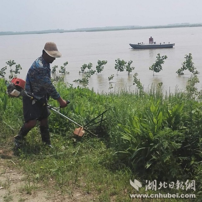 站在簰洲灣堤上,只見江水寬闊,水質(zhì)混濁,岸邊的防浪林樹干已被淹沒大半,只露出一蓬蓬的樹枝。原本空曠的堤頂公路,多了一些哨棚。內(nèi)岸邊,星散分布的群眾,手持鐮刀或除草機,正在忙碌地清障除雜。每隔一段距離,都有一個防汛哨屋,鮮艷的五星紅旗迎風飄揚,各個分指揮部已經(jīng)設(shè)立。