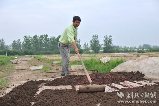 湯大學(xué)的蚯蚓養(yǎng)殖基地面積51畝。緊鄰村道,一排排蚯蚓床蔓延開(kāi)來(lái)?;乩铮夹g(shù)合伙人譚新武拿著木耙子,正在一壟壟土丘上松土。