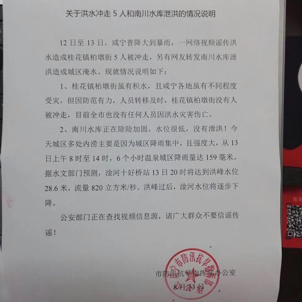 湖北日報網(wǎng)訊(通訊員敖瓊)12日至13日,咸寧普降大到暴雨,一網(wǎng)絡(luò)視頻謠傳洪水造成桂花鎮(zhèn)柏墩街5人被沖走,另有網(wǎng)友轉(zhuǎn)發(fā)南川水庫泄洪造成城區(qū)淹水。咸寧市防汛抗旱指揮部辦公室發(fā)布說明:這些均為不實信息!情況說明如下: