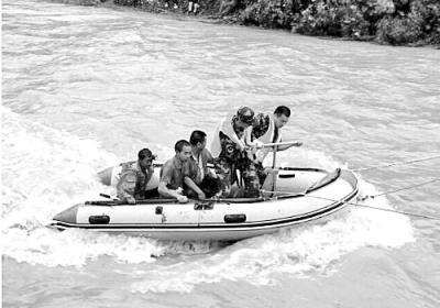 消防官兵立即用拋投器將繩索投至河對岸,隨后,一名消防員身穿救生衣,采取大繩橫渡的方式,涉水到達對岸,并將繩索固定好。稍后,消防官兵借助水面橫行艇與繩索,一趟又一趟地橫渡該河,將全部被困人員接回安全地帶。