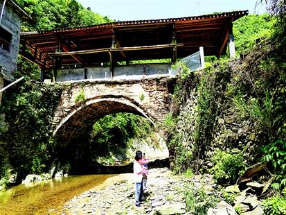 石城鎮(zhèn)文化站站長龔益來介紹,2015年6月2日暴雨,石橋部分被沖毀。他聯(lián)系上從塔坳村走出去的加拿大籍華人汪十友,募資10萬元,加上鄉(xiāng)鄰捐助,花費(fèi)13萬余元于當(dāng)年9月重修。為整舊如舊,橋基上的壘石仍保留當(dāng)年瑤族先民的遺存,清光緒十四年的修橋記錄原樣保存在前面橫梁上,此次修橋記錄則刻在后面橫梁上。