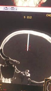圖為:CT片顯示,胡師傅的右額顱內(nèi)有根釘子