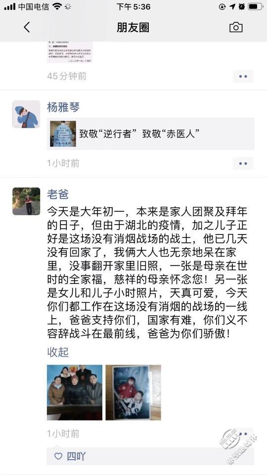 “國家有難,你們義不容辭戰(zhàn)斗在最前線,爸爸為你們驕傲,爸爸支持你們?!边@是市人民醫(yī)院呼吸內(nèi)科住院醫(yī)師姚威的爸爸發(fā)的朋友圈內(nèi)容。這位爸爸也和大家一樣,既擔(dān)心兒子的安危,卻也為兒子感到驕傲和自豪。