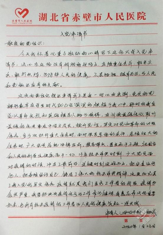 “今天我懷著無比激動的心情寫下這份入黨申請書,決心在這場沒有硝煙的戰(zhàn)場上,不畏犧牲,挺身而出。”這是來自市人民醫(yī)院90后呼吸內(nèi)科住院醫(yī)師姚威的入黨申請書。