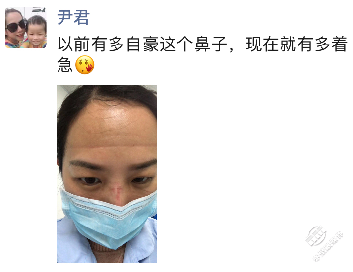 “以前有多自豪這個(gè)鼻子,現(xiàn)在就有多著急?!边B續(xù)高強(qiáng)度工作,長時(shí)間佩戴口罩,將護(hù)士尹君的鼻梁勒磨得傷痕累累。短暫的心疼與“著急”后,她又繼續(xù)奔忙在市人民醫(yī)院隔離病區(qū)。