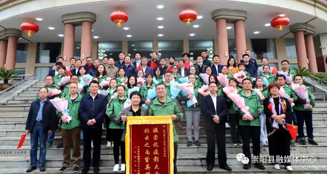 送別儀式上,杭鶯、鄭俊華等縣領(lǐng)導為全體云南醫(yī)療隊隊員獻上鮮花。隨后,杭鶯向云南醫(yī)療隊隊長董昭興頒授印有“援崇抗疫彰大愛 彩云之南皆英雄”錦旗并合影留念。