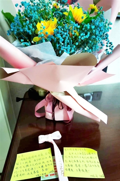 自稱為“云南小姐姐”的萬麗萍,將一束開得正艷的花和兩張小紙條擺在桌上?!坝窀纾遗路謩e時的淚崩,給你留了小紙條。咸寧的55天,感謝你無微不至的照顧,把我們一個個養(yǎng)得胖了一大圈。雖然回去要減肥,還是感恩、感謝!”
