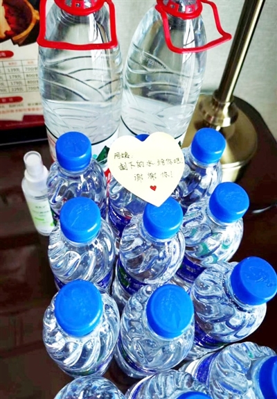 一位隊員留下了十多瓶礦泉水,并留言:阿姨,剩下的水給你們吧,謝謝你!
