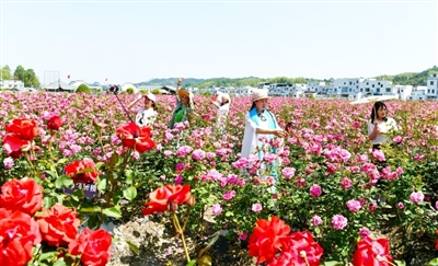 通城縣麥?zhǔn)墟?zhèn)冷段村引進資金,在200余畝荒地上種植月季花。20多個品種的月季正值盛花期,每天吸引眾多游客游玩賞花,當(dāng)?shù)匕才?0多位農(nóng)民配套服務(wù),在家門口增收。