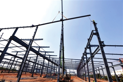 10月13日,咸安經(jīng)濟(jì)開發(fā)區(qū)華寧防腐科技產(chǎn)業(yè)園二期項目,工人們正在吊裝鋼架廠房。