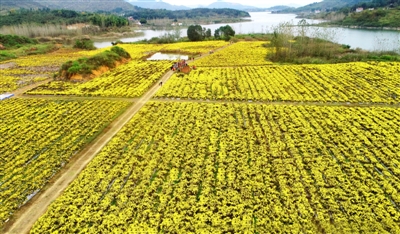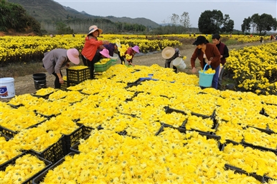 11月4日,通山縣燕廈鄉(xiāng)湖畔村皇菊種植基地,金絲皇菊怒放,猶如一張金色地毯舒展在田野上,村民穿梭在花叢中采收菊花。燕廈鄉(xiāng)湖畔村是典型的庫(kù)區(qū)貧困村,近年來,市公共檢驗(yàn)檢測(cè)中心駐村工作隊(duì)和燕廈鄉(xiāng)黨委政府結(jié)合湖畔村地理環(huán)境,成立村集體合作社,打造60畝金絲皇菊種植基地,延伸菊花深加工產(chǎn)業(yè)鏈,通過與貧困戶采取“勞務(wù)聯(lián)結(jié)機(jī)制”簽署合同協(xié)議,讓村民實(shí)現(xiàn)家門口就業(yè)。