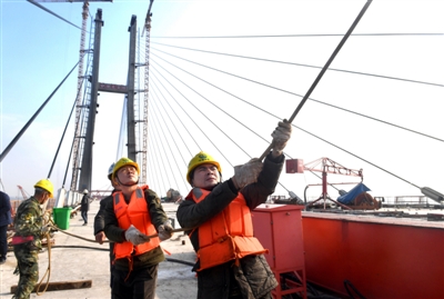 “再起來一點,往左偏5公分,好,?!痹诤鷺s鵬的指揮下,一塊離水面40多米高的鋼梁被順利吊起。