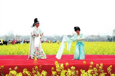 精彩的文藝演出、極具地方風情的民俗表演和國家非物質(zhì)文化遺產(chǎn)提琴戲演唱,與花海交相輝映,為大家?guī)砹艘暵犑⒀?。開幕后,游客開始游玩賞景,大家邊感嘆七彩油菜花的美,邊呼朋引伴拍照留念,人花相映襯,美不勝收。除了賞花,大家還紛紛品嘗特色美食,購買當?shù)靥厣r(nóng)產(chǎn)品。