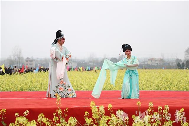 油菜花有普通的黃色、橙黃、桃紅、紫紅等顏色,游客擠在田埂上拍照。青山鎮(zhèn)在菜地里搭起了舞臺(tái),舉辦首屆七彩油菜花節(jié)開(kāi)幕式,提琴戲、腰鼓等好戲連臺(tái),《我家在崇陽(yáng)》歌聲在花海中回蕩。