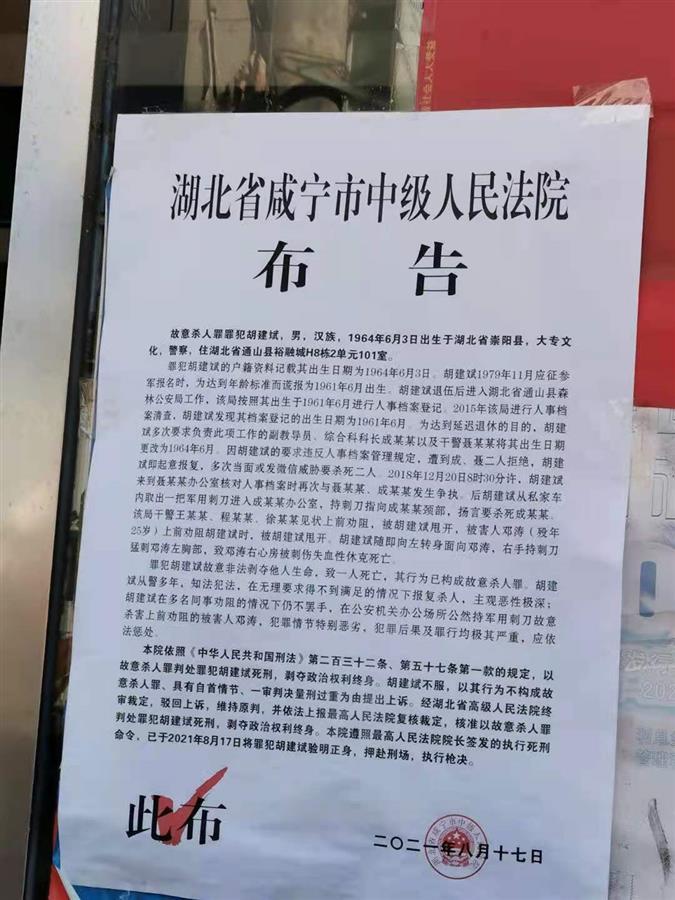 布告顯示,罪犯胡建斌因犯故意殺人罪,已于布告發(fā)布當(dāng)天,對其執(zhí)行死刑。9月5日,楚天都市報(bào)極目新聞?dòng)浾邅淼疆?dāng)事人鄧濤家中探望,在其親屬的講述和還原下,這位有血有肉的英雄仿佛再次回到人們眼前。