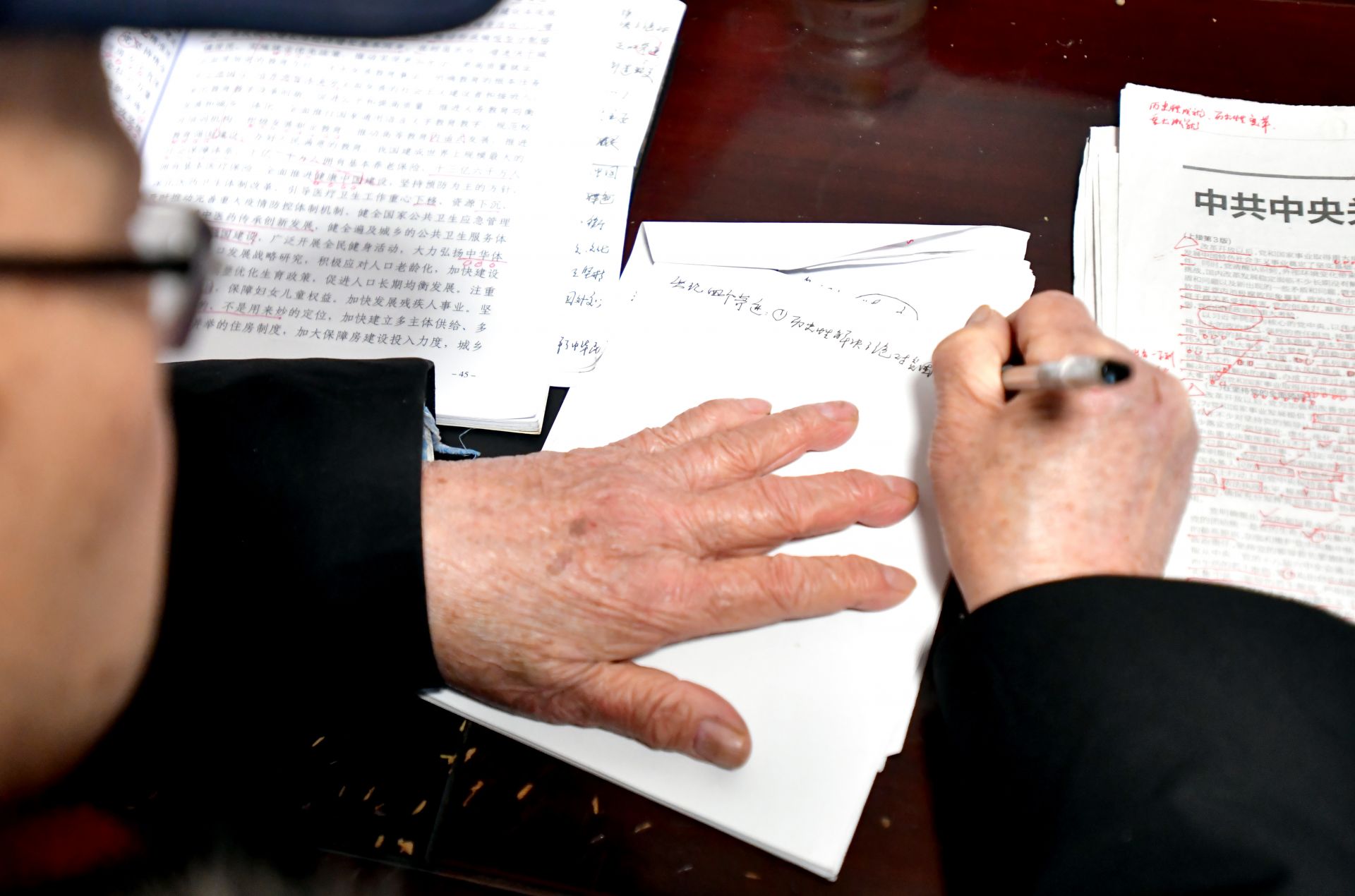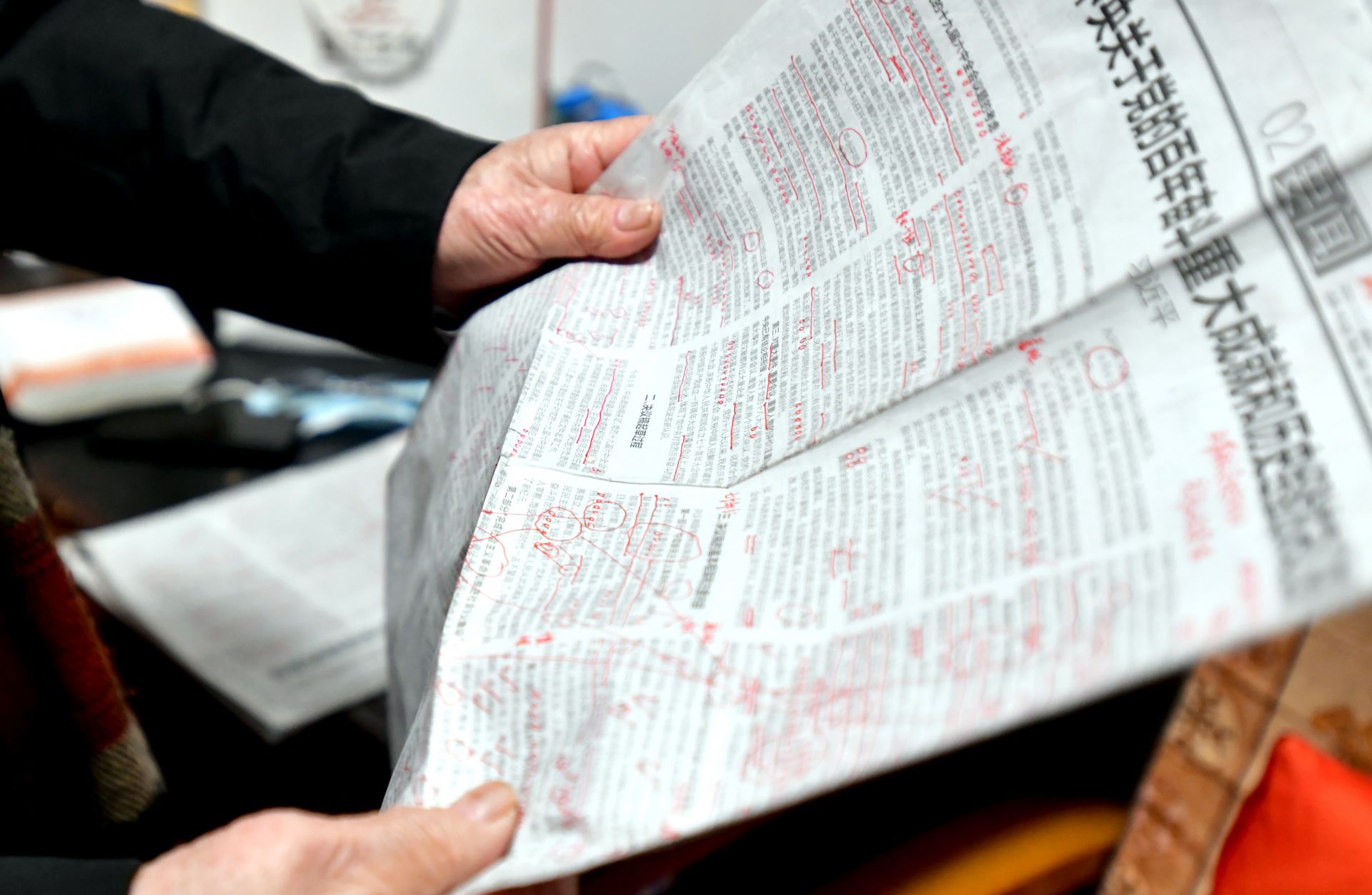 他的書桌上堆滿了厚厚的書籍,筆筒插著一面小國旗,面前攤開的報紙上,紅色的標注分外醒目。老人正一筆一劃、不疾不徐地做著筆記。