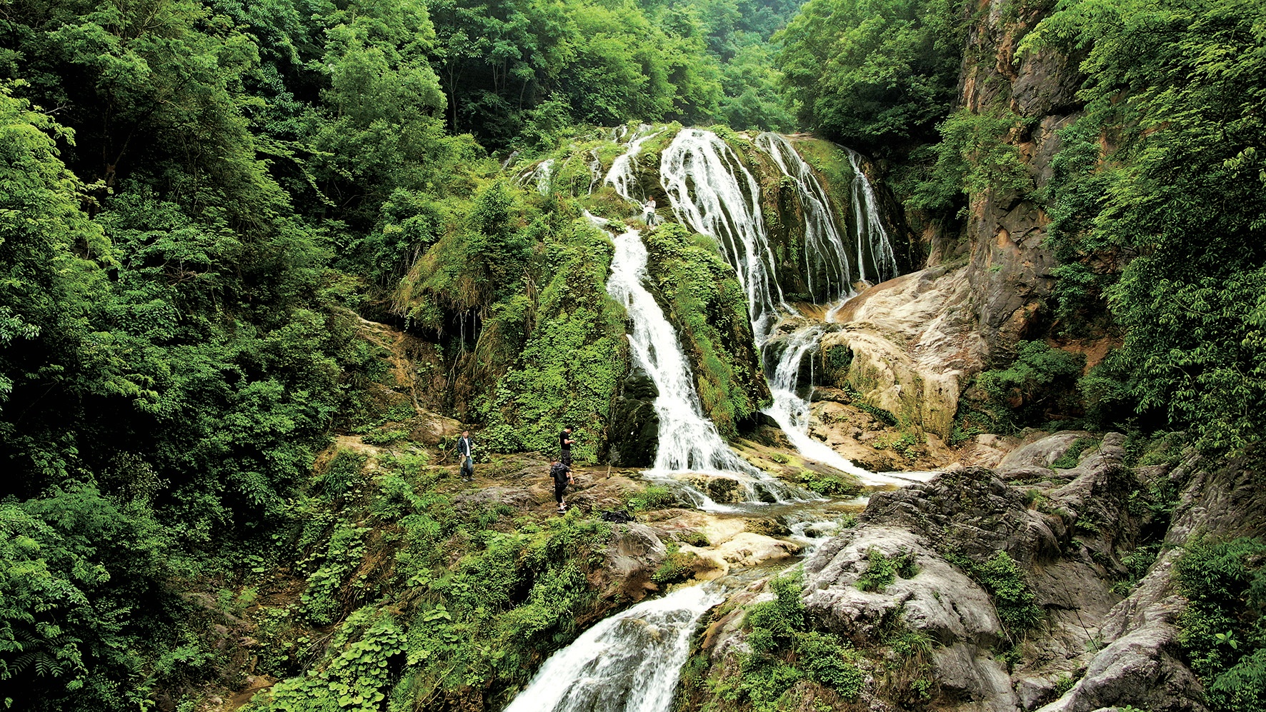 順著溪流下行半個多小時,一條十幾米寬的激流被陡峭山崖阻擋后形成無數(shù)分支,從約20米高的大型鈣化梯坎上跌落。這是該河段最為壯觀的一處瀑布,氣勢磅礴,聲聞十里,如戰(zhàn)鼓擂動、萬馬奔騰。