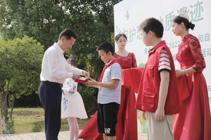 湖北青龍山恐龍蛋化石群國(guó)家級(jí)自然保護(hù)區(qū)管理局局長(zhǎng)、黨組書(shū)記姚天國(guó)為獲獎(jiǎng)學(xué)生頒獎(jiǎng)。