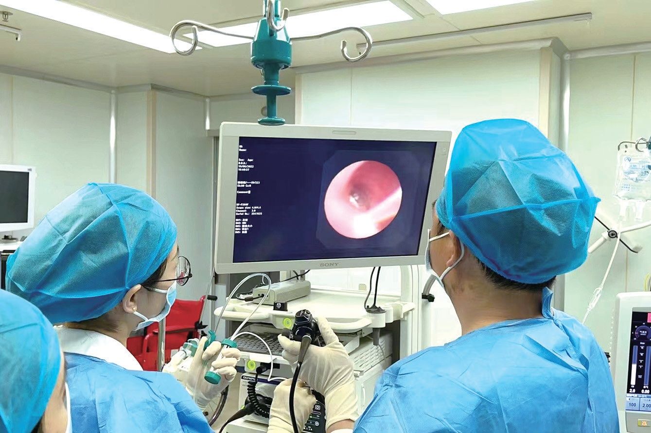 為患兒進(jìn)行支氣管軟鏡取物手術(shù)。