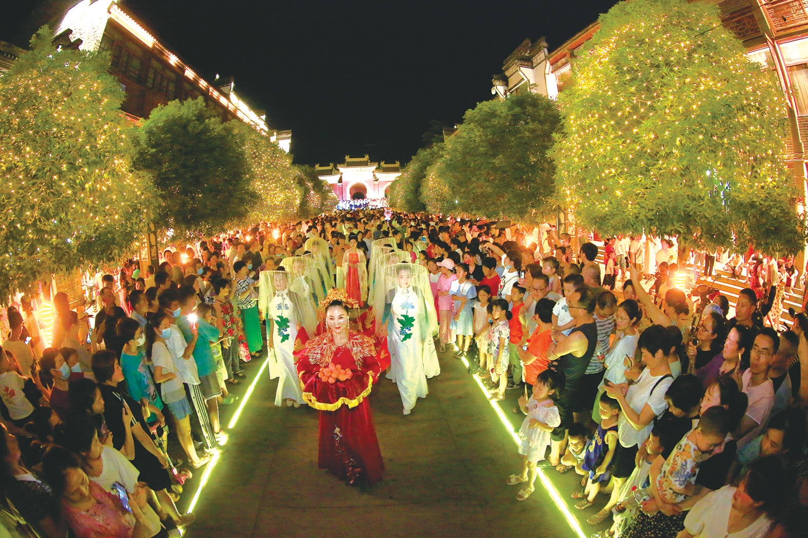 15日至16日晚,在武當(dāng)山玉虛街舉行的非遺廟會(huì),點(diǎn)亮夜經(jīng)濟(jì)。除了極具看點(diǎn)的武當(dāng)非遺文化展演,無(wú)人機(jī)天幕秀也令人震撼,此外,琳瑯滿(mǎn)目的美食極大滿(mǎn)足了游客的味蕾體驗(yàn),紅火熱鬧的玉虛街已成為游客夜游武當(dāng)?shù)拇蚩ǖ亍D/記者 朱江 特約記者 范學(xué)峰