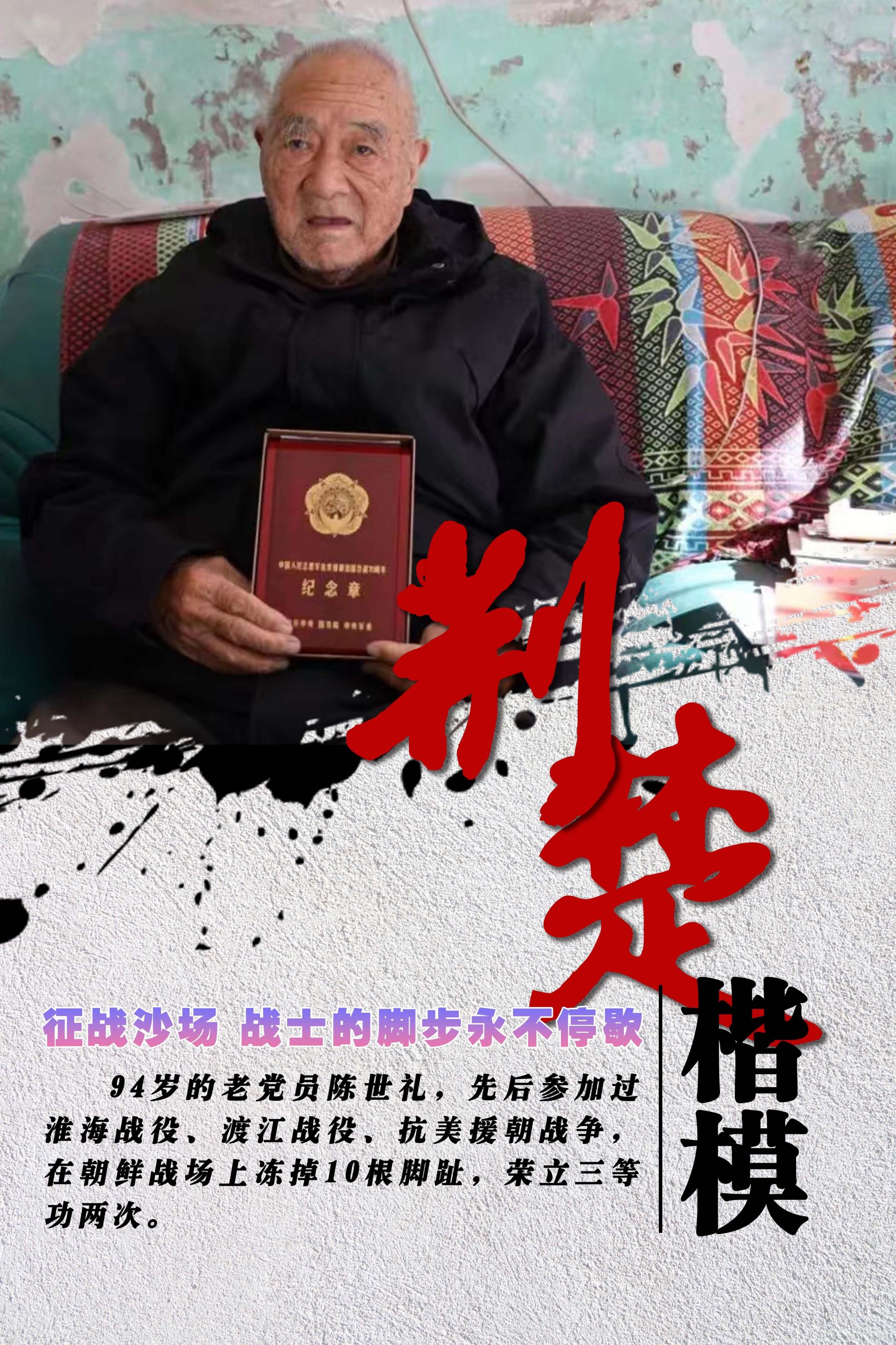 荊楚網(wǎng)(湖北日?qǐng)?bào)網(wǎng))訊(通訊員 殷霞)陳世禮,男,1928年5月生,中共黨員,原湖北省黃岡市黃州區(qū)面粉廠黨支部書記。他先后參加淮海戰(zhàn)役、渡江戰(zhàn)役、抗美援朝戰(zhàn)爭(zhēng),在朝鮮戰(zhàn)場(chǎng)上凍掉10根腳趾,兩次榮立三等功。1957年,陳世禮退役,主動(dòng)選擇回到家鄉(xiāng),在黃岡糧食系統(tǒng)工作數(shù)十年。70多年來,他淡泊低調(diào),從不居功自傲、從不在人前顯耀。陳世禮曾榮獲“荊楚楷?!睒s譽(yù)。