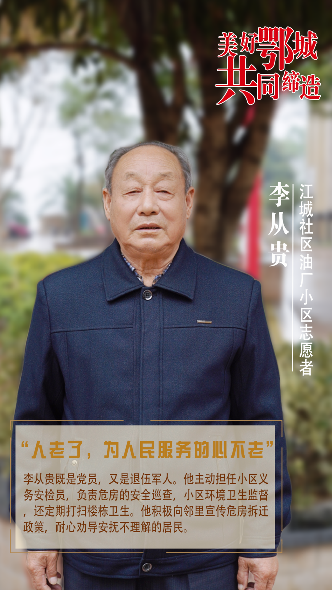 李從貴既是黨員,又是退伍軍人。他主動擔任小區(qū)義務(wù)安檢員,負責危房的安全巡查,小區(qū)環(huán)境衛(wèi)生監(jiān)督,還定期打掃樓棟衛(wèi)生。他積極向鄰里宣傳危房拆遷政策,耐心勸導(dǎo)安撫不理解的居民。