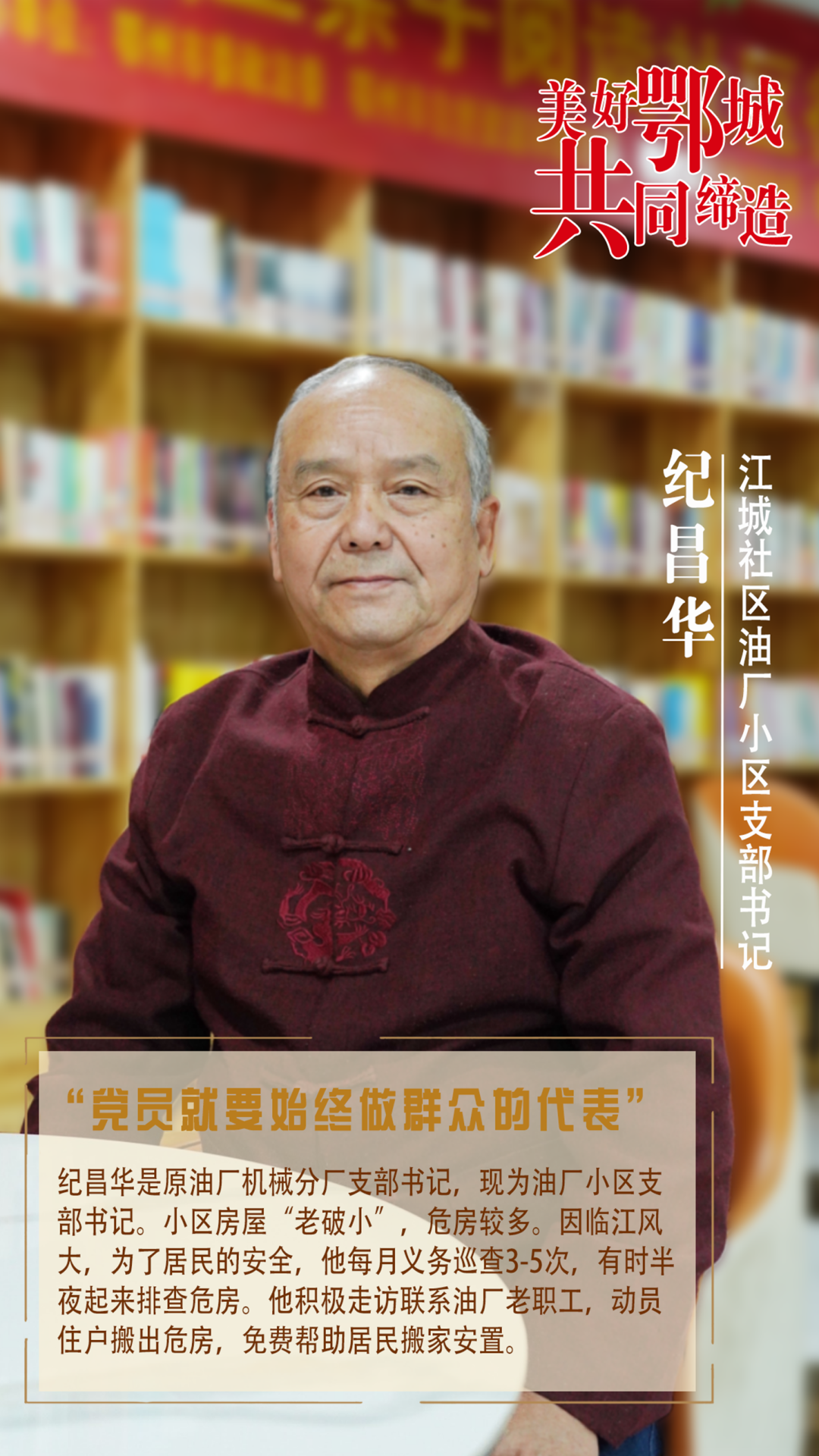 紀昌華是原油廠機械分廠支部書記,現(xiàn)為油廠小區(qū)支部書記。小區(qū)房屋“老破小”,危房較多。因臨江風大,為了居民的安全,他每月義務(wù)巡查3-5次,有時半夜起來排查危房。他積極走訪聯(lián)系油廠老職工,動員住戶搬出危房,免費幫助居民搬家安置。