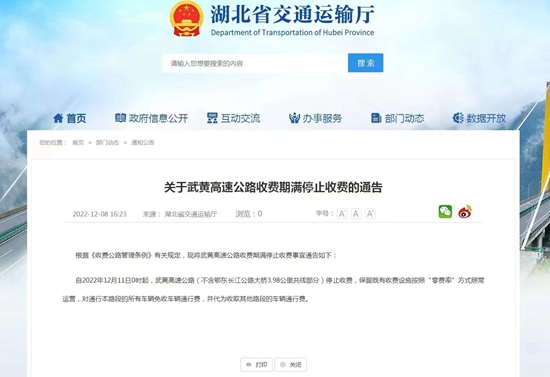 剛剛,湖北省交通運輸廳發(fā)布關(guān)于武黃高速公路收費期滿停止收費的通告。