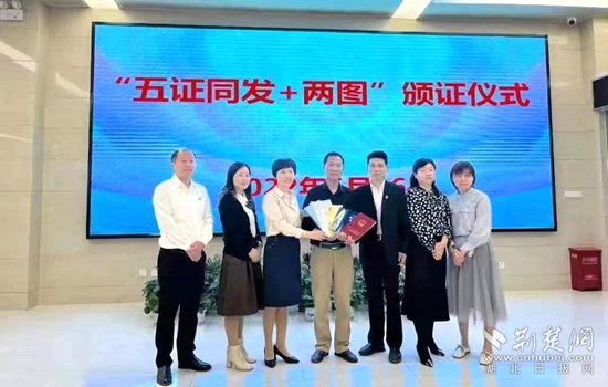 羅田縣政務(wù)服務(wù)和大數(shù)據(jù)管理局為企業(yè)頒發(fā)“五證”。通訊員 供圖