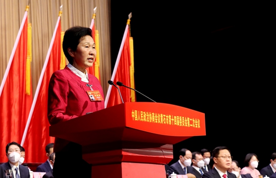 周蔚芬作《中國(guó)人民政治協(xié)商會(huì)議黃石市第十四屆委員會(huì)常務(wù)委員會(huì)工作報(bào)告》。阮瓊 攝