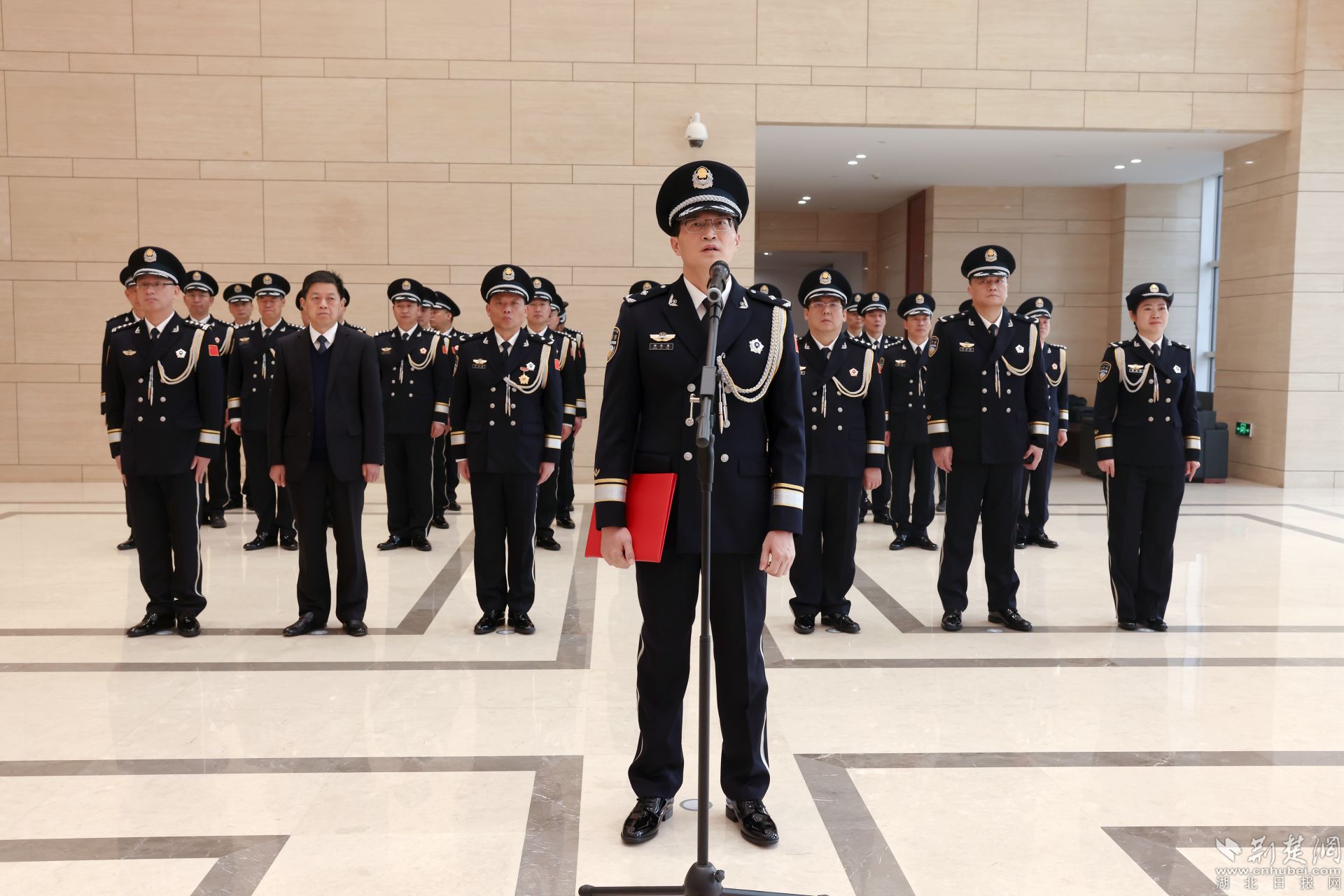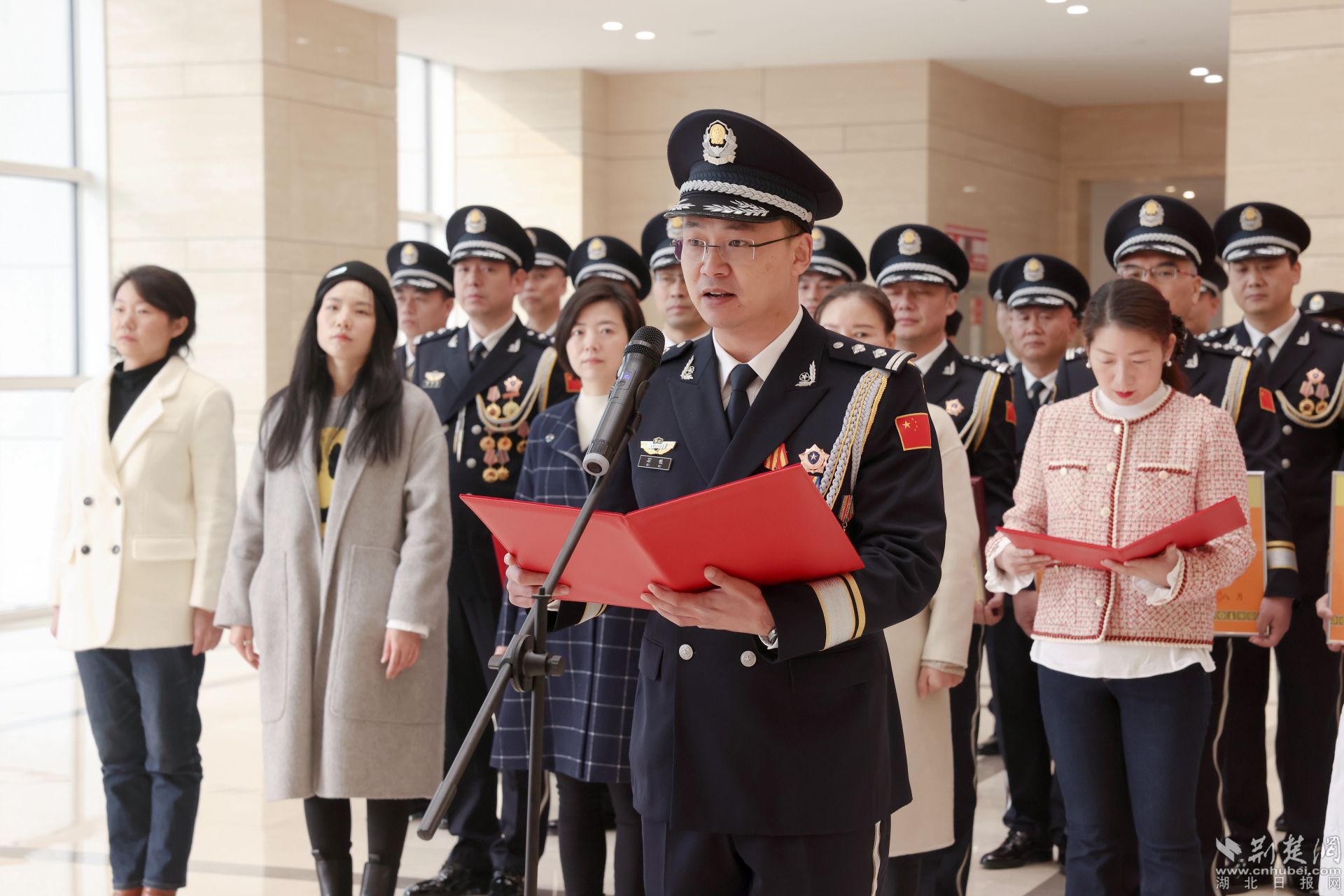 飄揚(yáng)的警旗下,黃石市副市長、市公安局黨委書記、局長黃志勇帶領(lǐng)大家重溫入警誓詞:“我是中國人民警察,我宣誓……”全體民警高舉右臂,緊握右拳,鏗鏘有力的話語表達(dá)對公安事業(yè)的無限熱愛。