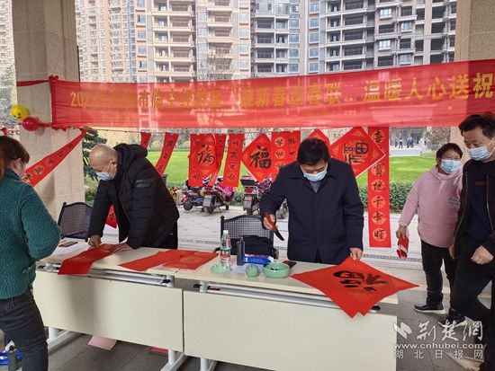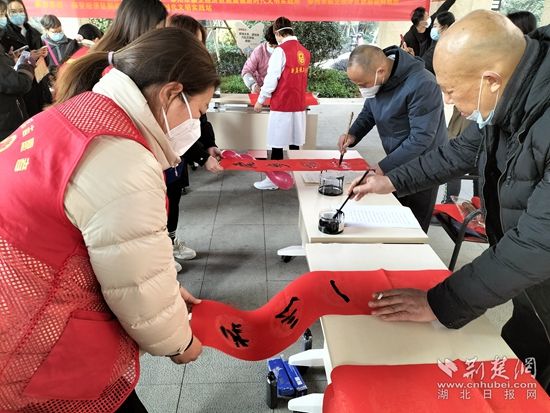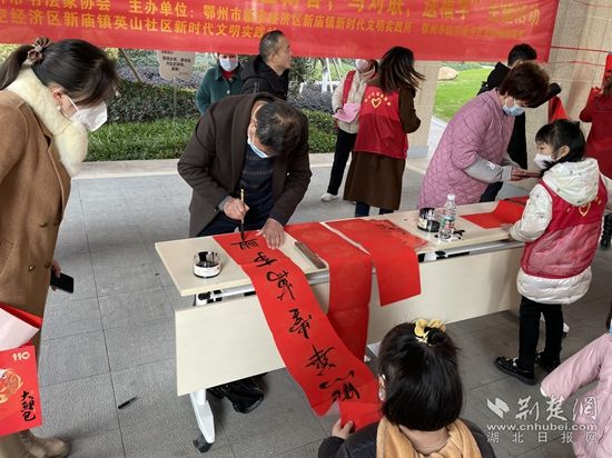 在銀海龍辰小區(qū),來自鄂州市書法協(xié)會的各位書法家現(xiàn)場“揮毫潑墨”,應(yīng)小區(qū)居民的要求,現(xiàn)場書寫春聯(lián)和“福”字。此次活動,共計(jì)為居民書寫贈送160副春聯(lián)、100幅“?!弊?。